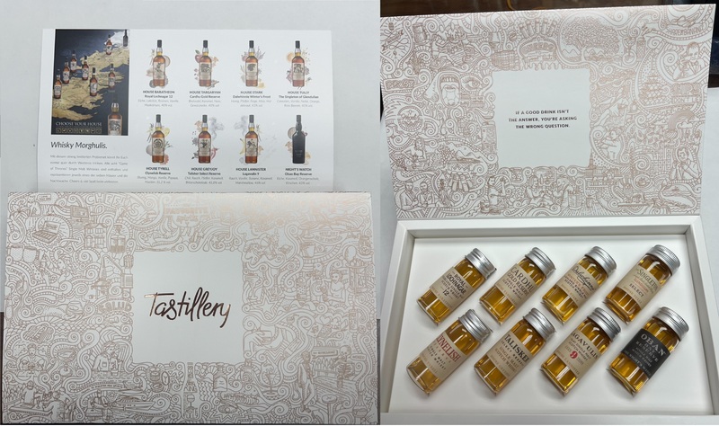 1) HOUSE BARATHEON Royal Lochnagar 12 40% vol. x 1 (30ml) 2) HOUSE TARGARYAN Cardhu Gold Reserve 40% vol. x 1 (30ml) 3) HOUSE STARK Dalwhinnie Winter's Frost 43% vol. x 1 (30ml) 4) HOUSE TULLY The Singleton of Glendullan 40% vol. x 1 (30ml) 5) HOUSE TYRELL Clynelish Reserve 52.2% vol. x 1 (30ml) 6) HOUSE GREYJOY Talisker Select Reserve 45.8% vol. x 1 (30ml) 7) HOUSE LANNISTER Lagavulin 9 46% vol. x 1 (30ml) 8) NIGHT'S WATCH Oban Bay Reserve 43% vol. x 1 (30ml)